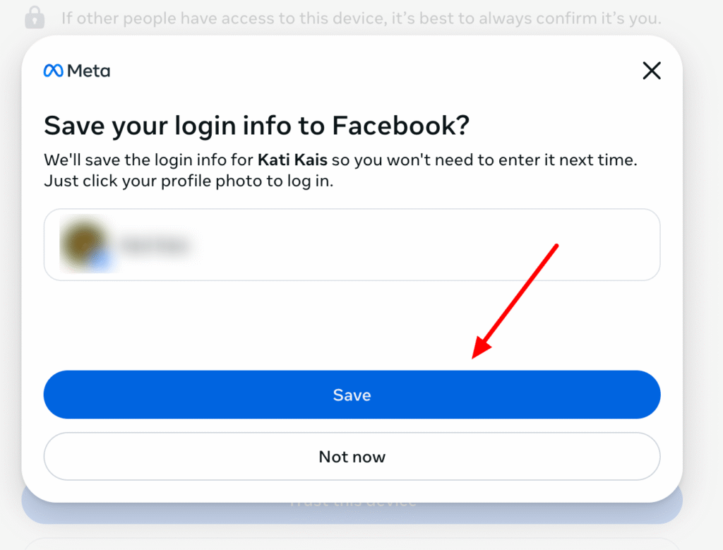 Kad Facebook 2FA kods ir ievadīts, nākamajā logā tev būs jānoklikšķina Save.