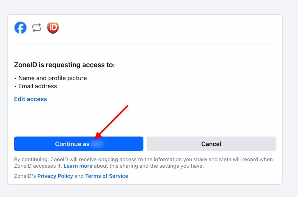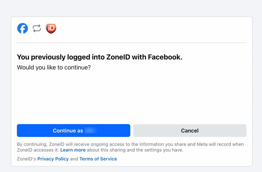 Tālāk tiks parādīta informācija par tavu Facebook kontu un saistīto ZoneID kontu izvēle. Ja šim Facebook kontam ir piesaistīti vairāki ZoneID konti, vari izvēlēties vēlamo nolaižamajā izvēlnē. Pēc tam noklikšķini Continue as ....