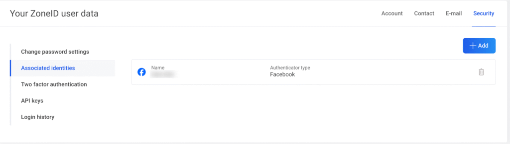 Lai piesaistītu Facebook savam ZoneID kontam, vispirms piesakies My Zone vadības panelī ar savu lietotājvārdu un paroli, pēc tam zem sava lietotājvārda atver Settings un Security. Tālāk izvēlies Associated identities.