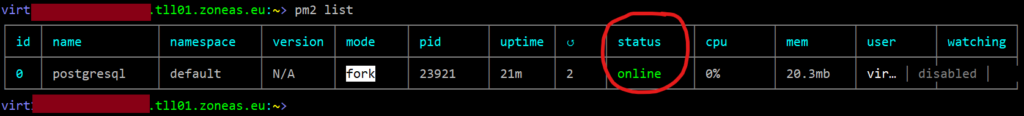 Pagaidi 3–4 minūtes, līdz pm2 list čaulā parāda postgresql lietotnes statusu: online.
