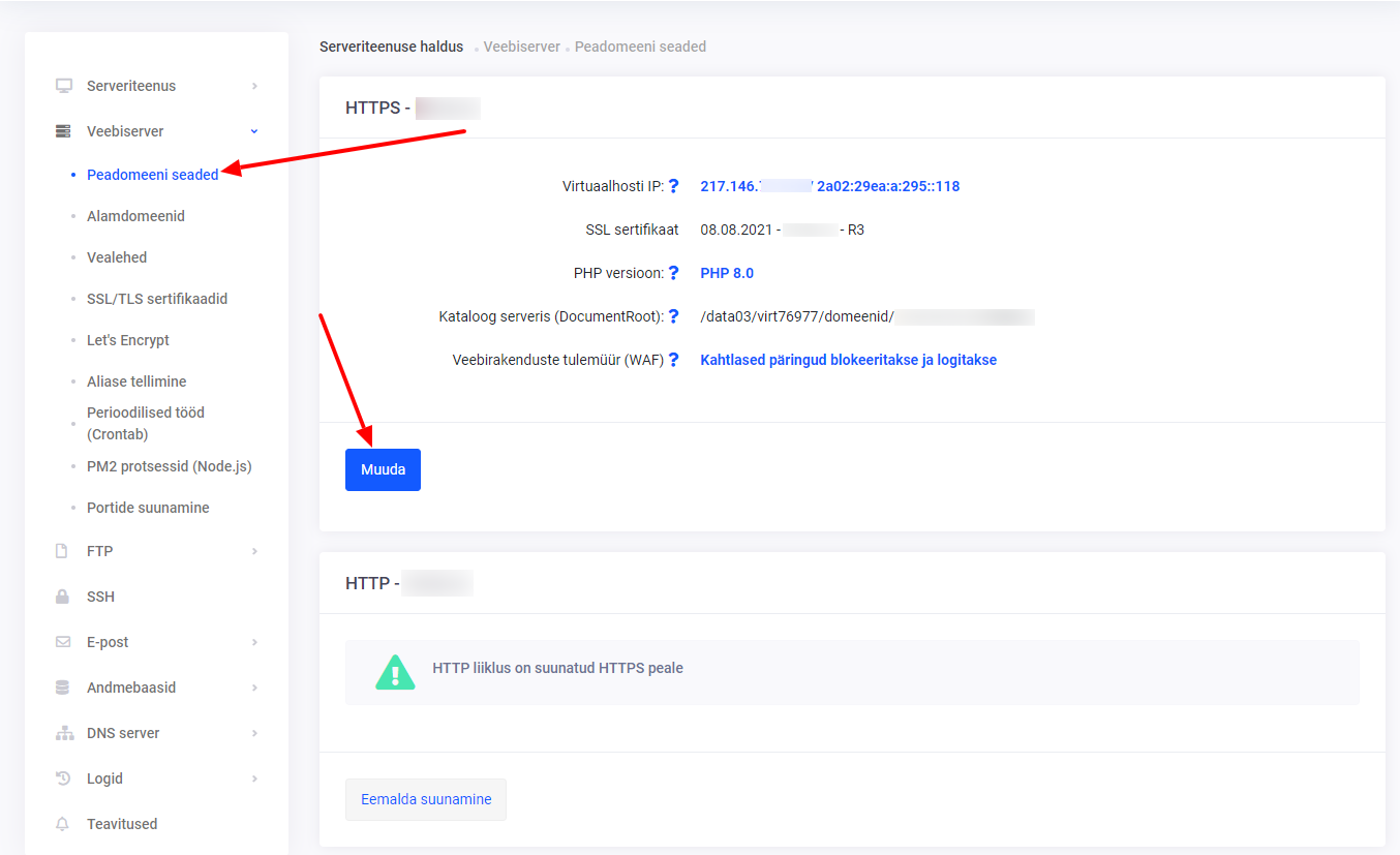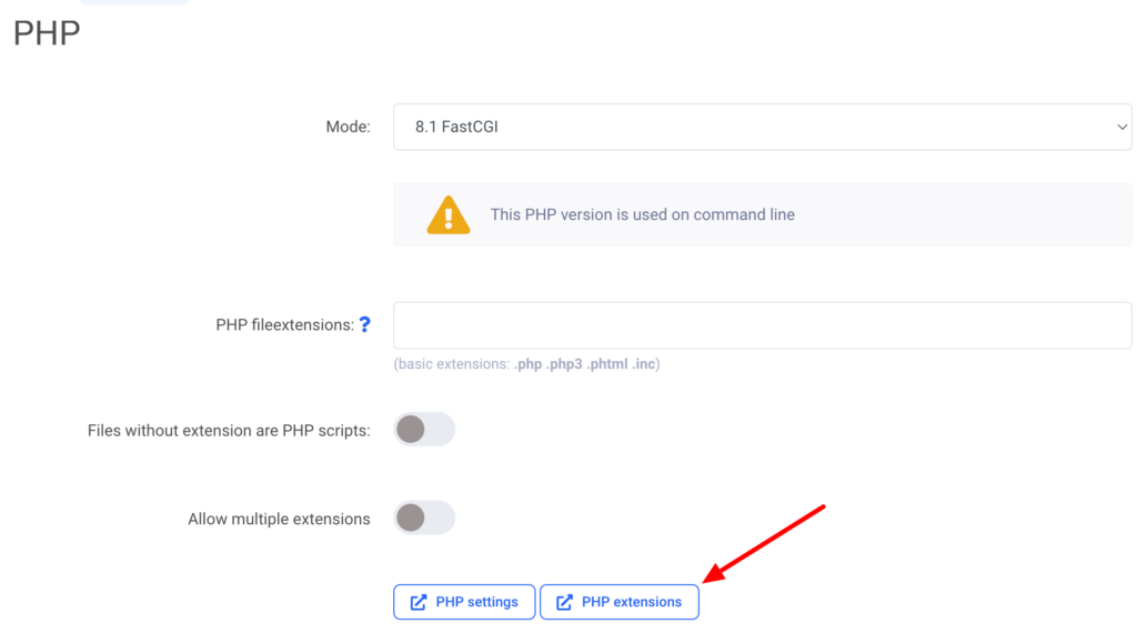 Lai aktivizētu PHP paplašinājumus, izvēlies “Webserver” -> “Main domain settings” un tur izvēlies “modify” -> “PHP extensions”.
