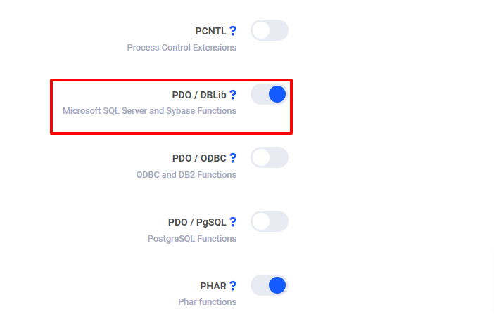 Lai izveidotu savienojumu ar MSSQL, tev ir jāaktivizē PDO / DBLib paplašinājums sadaļā PHP paplašinājumi.