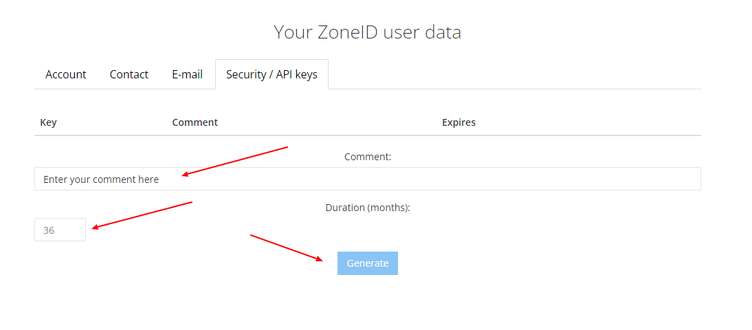 Pēc noklusējuma API atslēga ir derīga trīs gadus (36 mēnešus). Lai pievienotu jaunu atslēgu, nospied Generate.