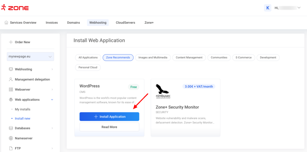 Lai instalētu lietotni, piesakies My Zone vadības panelī un augšējā izvēlnē noklikšķini uz Zone+.