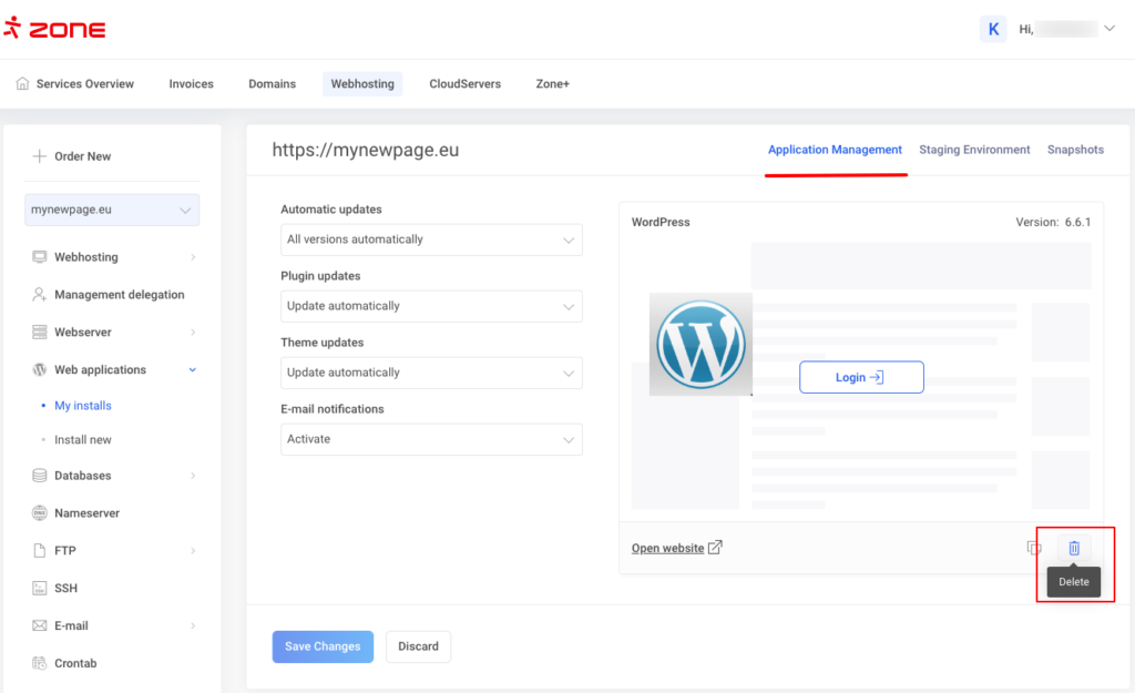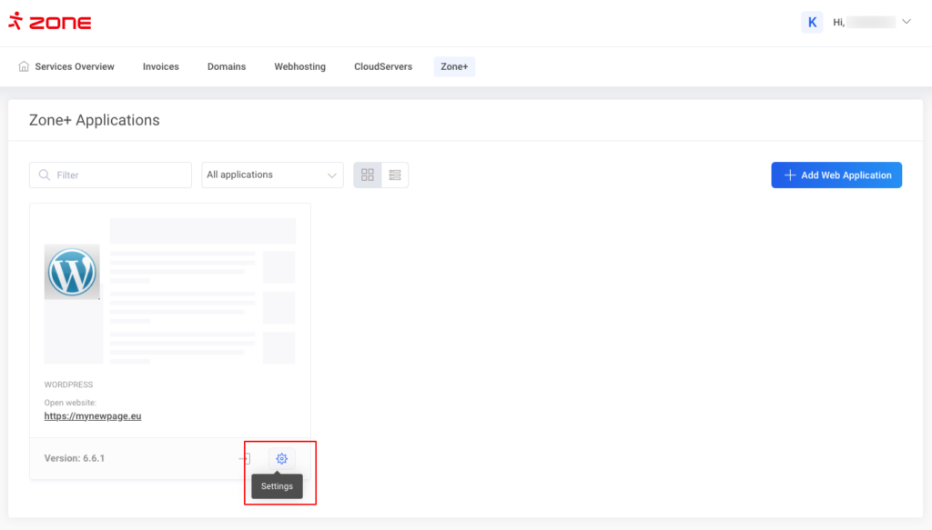 Lai dzēstu lietotni, izvēlnē Webhosting–> Web applications izvēlies My installs un noklikšķini uz pogas Settings