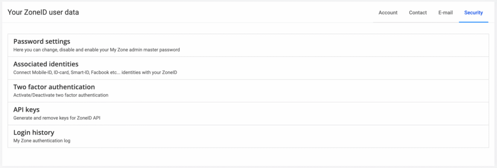Sadaļā Security tu vari mainīt ZoneID konta paroli, piesaistīt un pārvaldīt autentifikācijas rīkus, pārvaldīt API atslēgas un pārbaudīt savu My Zone pieteikšanās vēsturi.