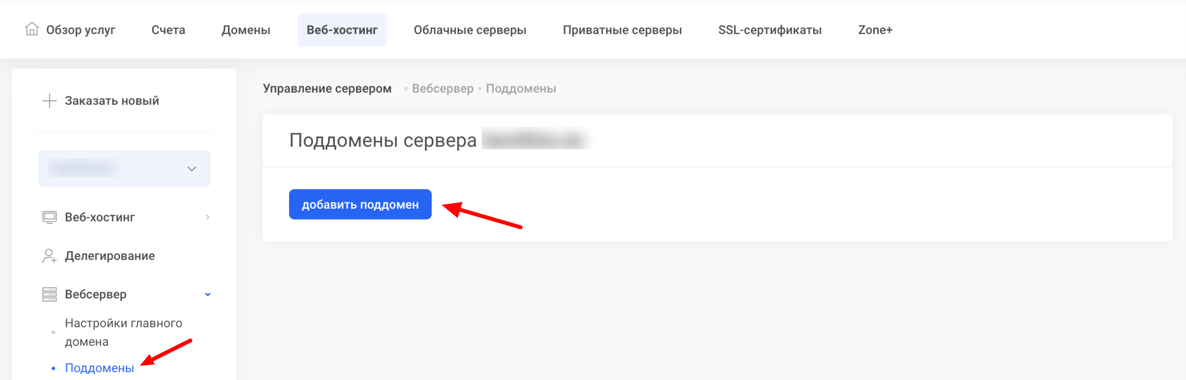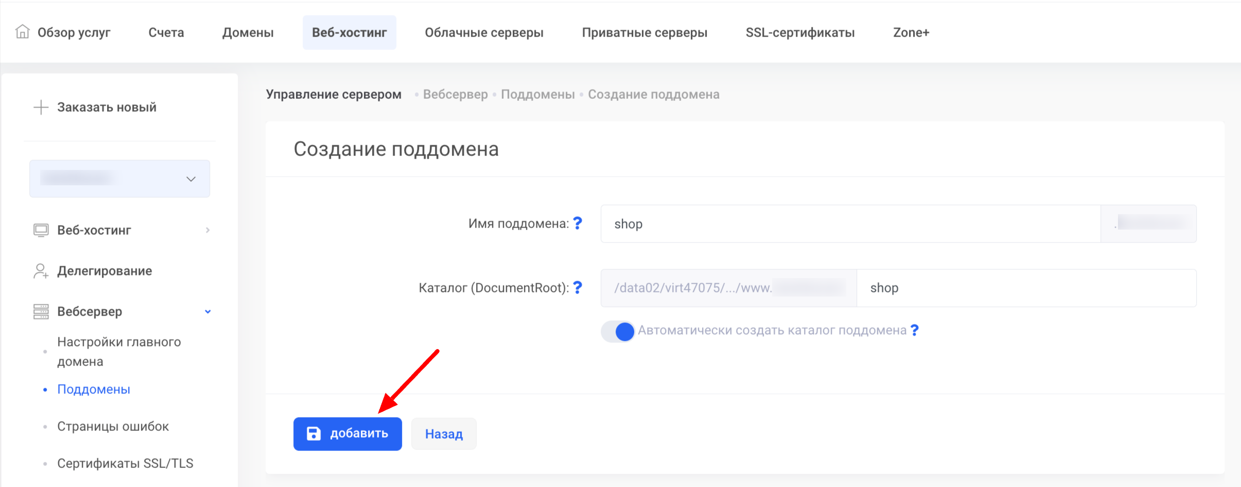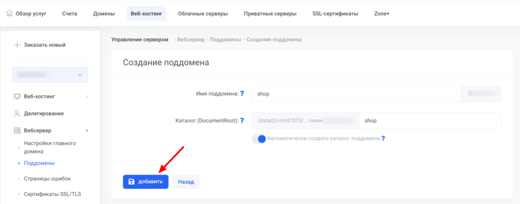 На новой странице введите название поддомена, например staging, test или shop.