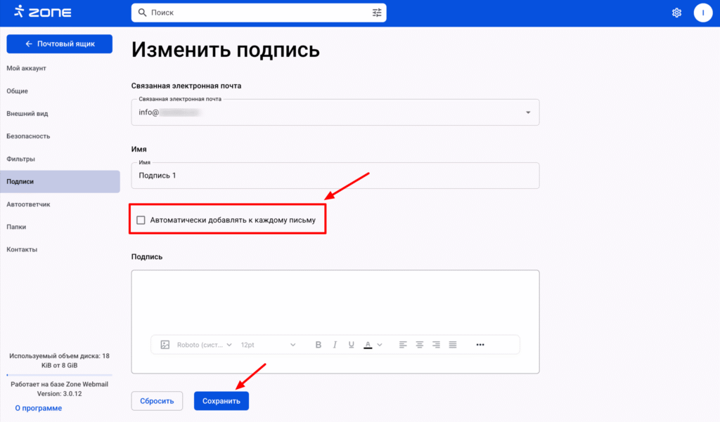 В среде webmail можно добавлять подписи к отправляемым письмам и управлять ими при необходимости.