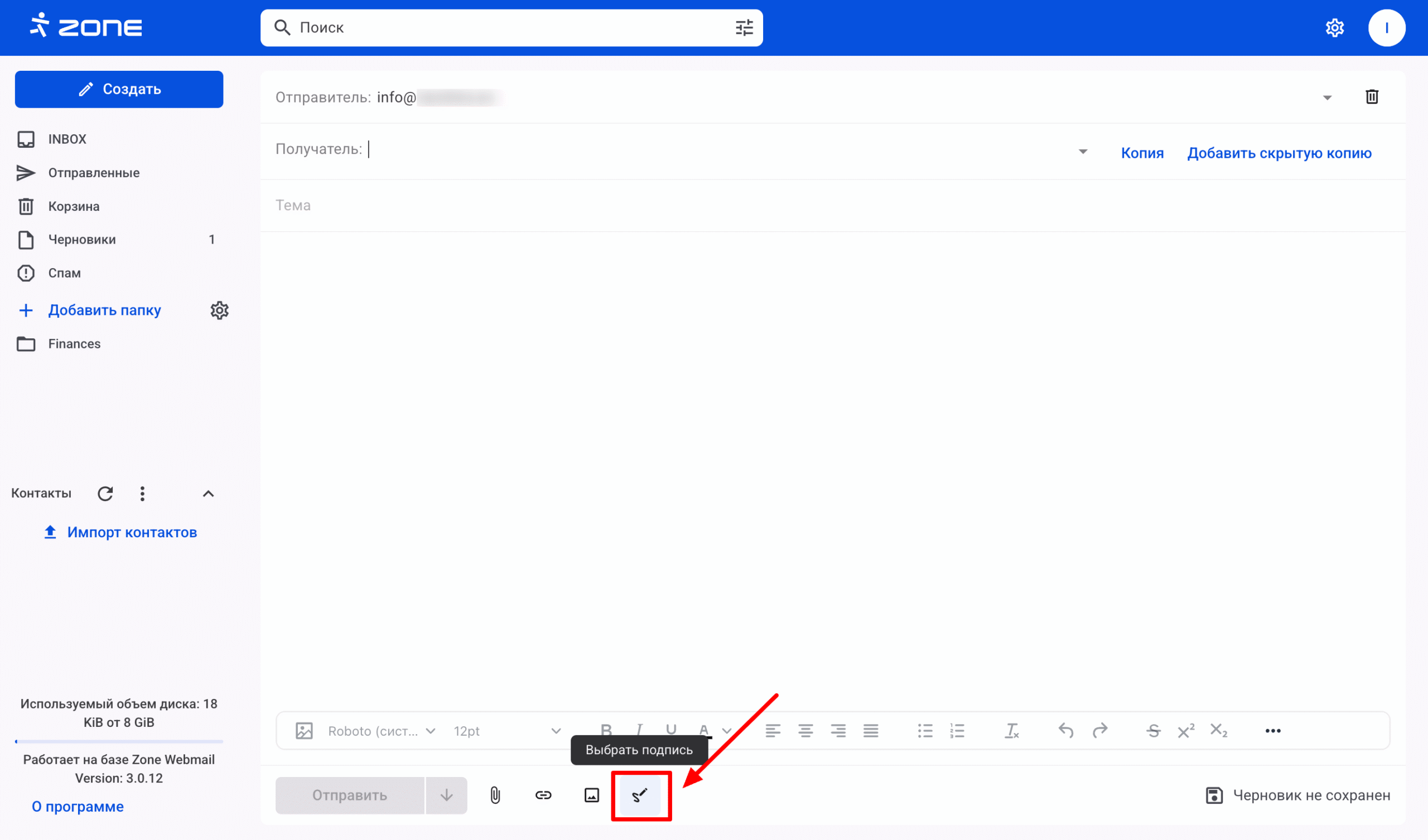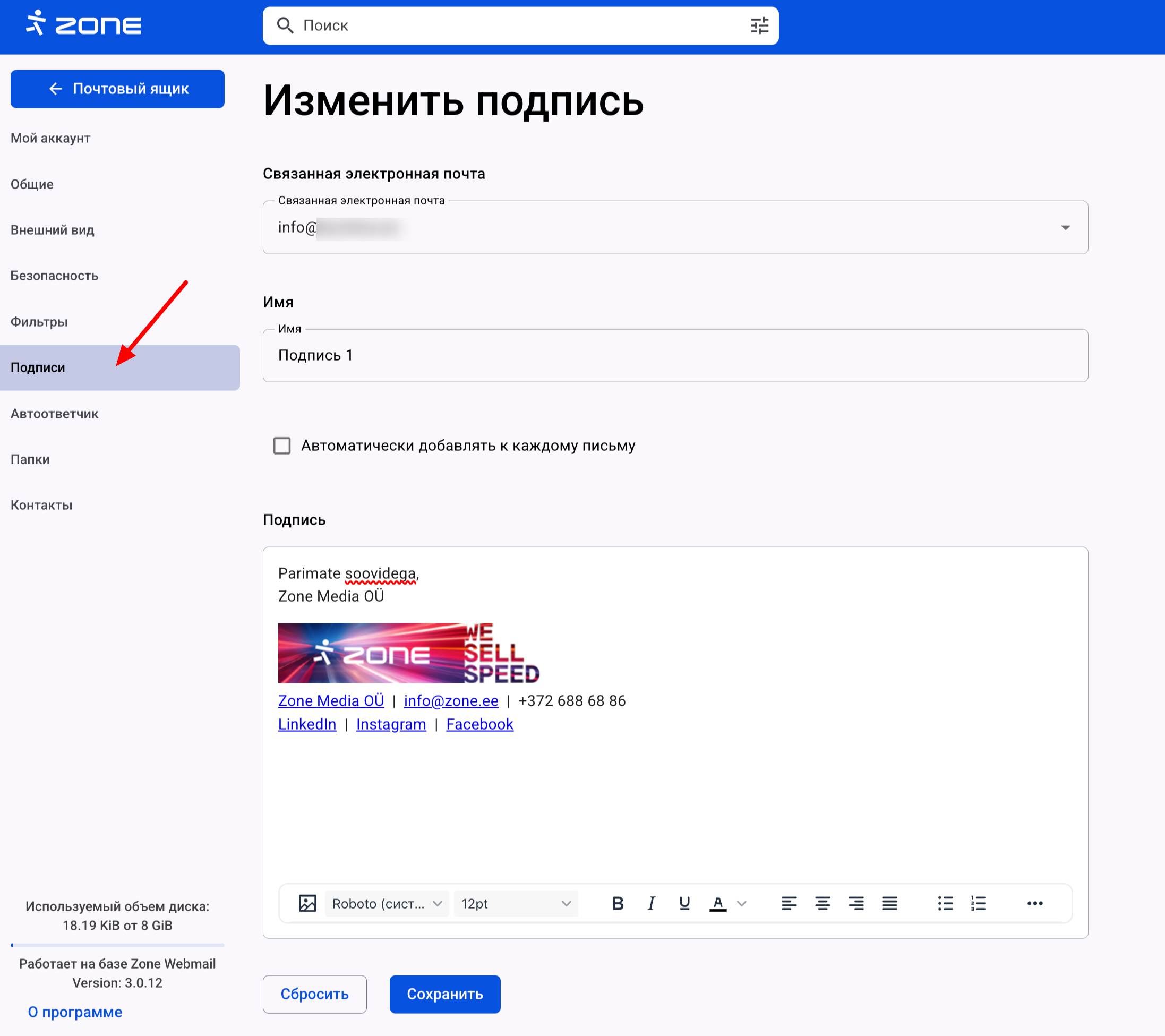 В среде webmail можно добавлять подписи к отправляемым письмам и управлять ими при необходимости.