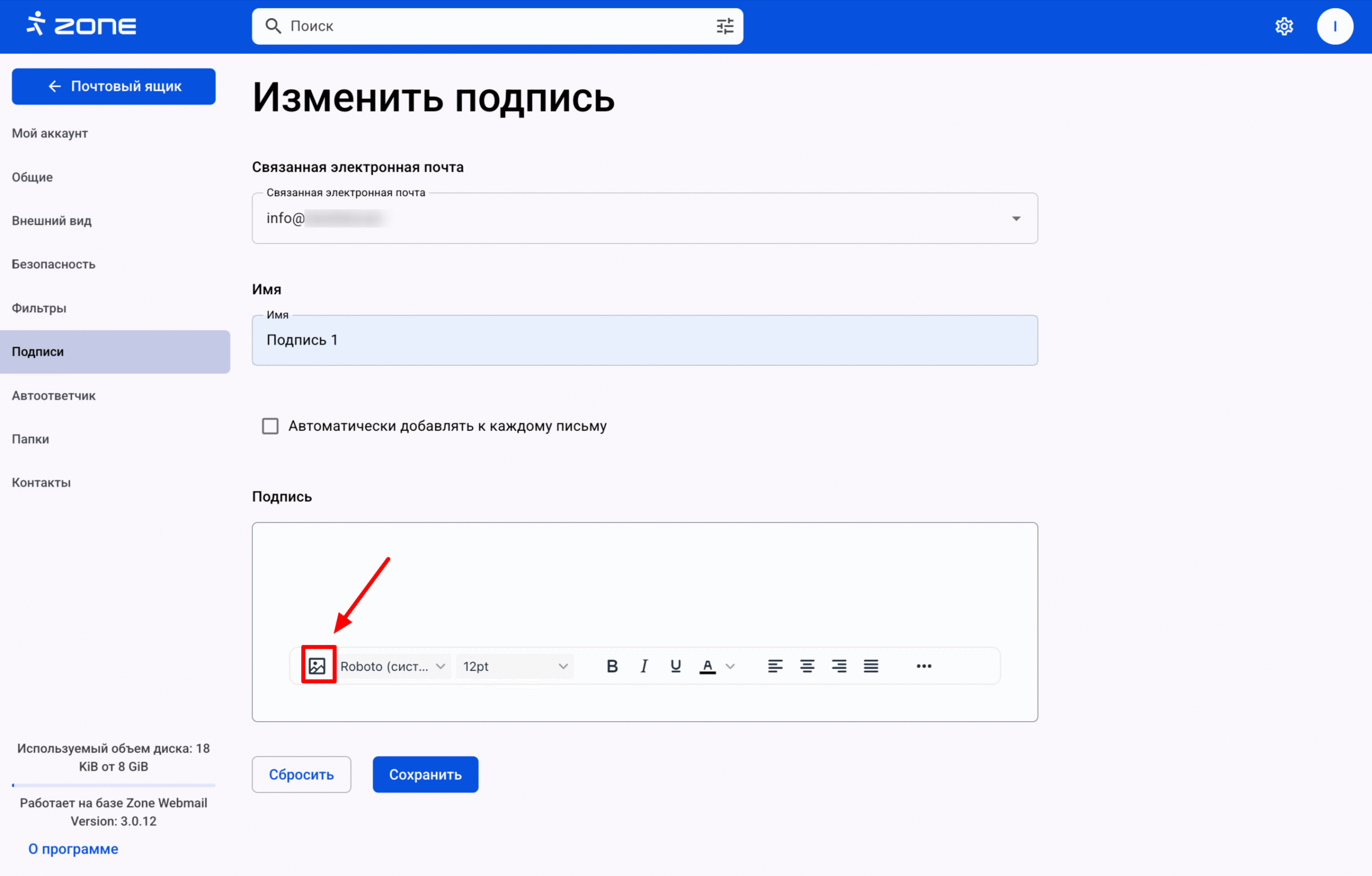 Подпись может содержать изображения, которые можно добавить с помощью соответствующей кнопки.