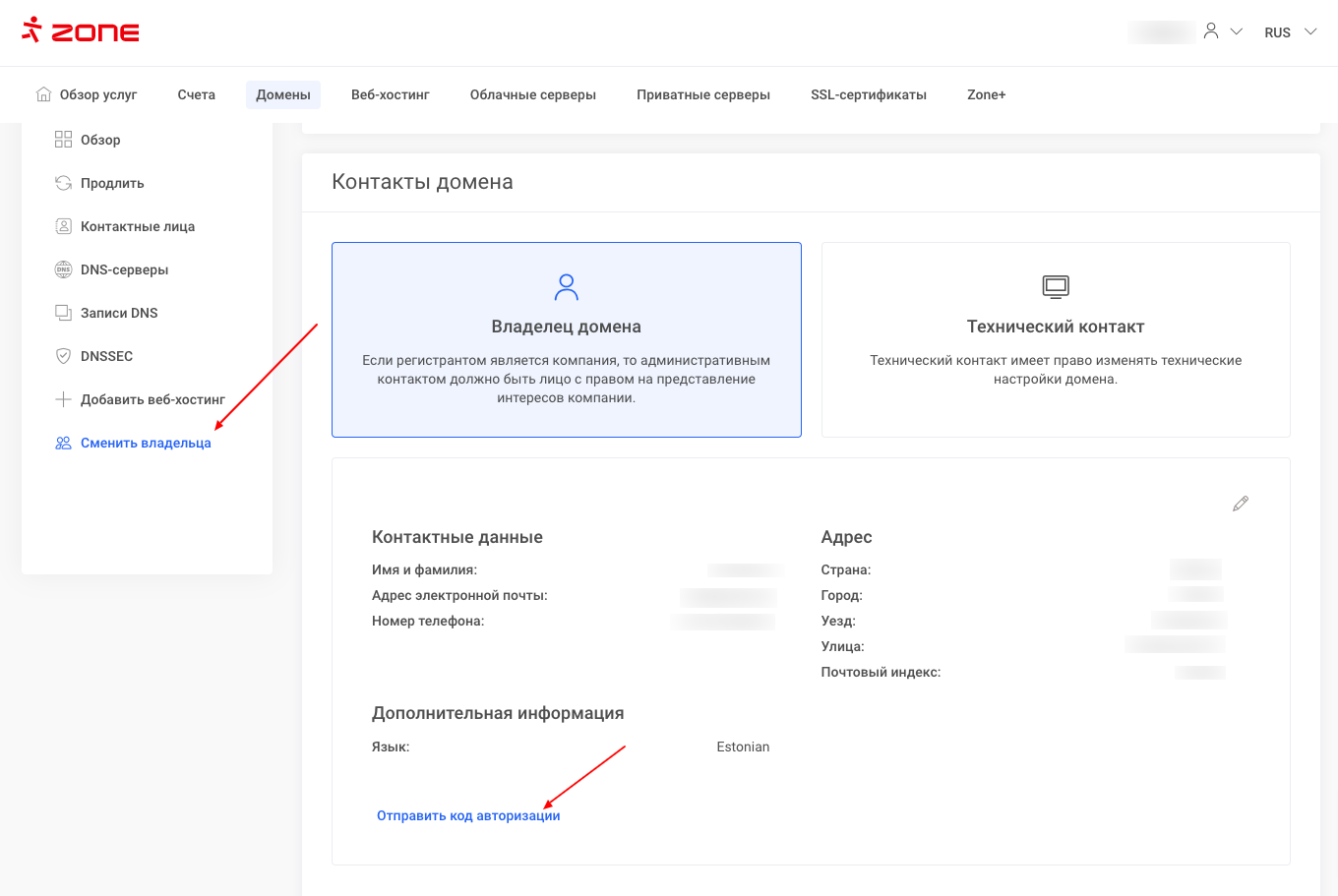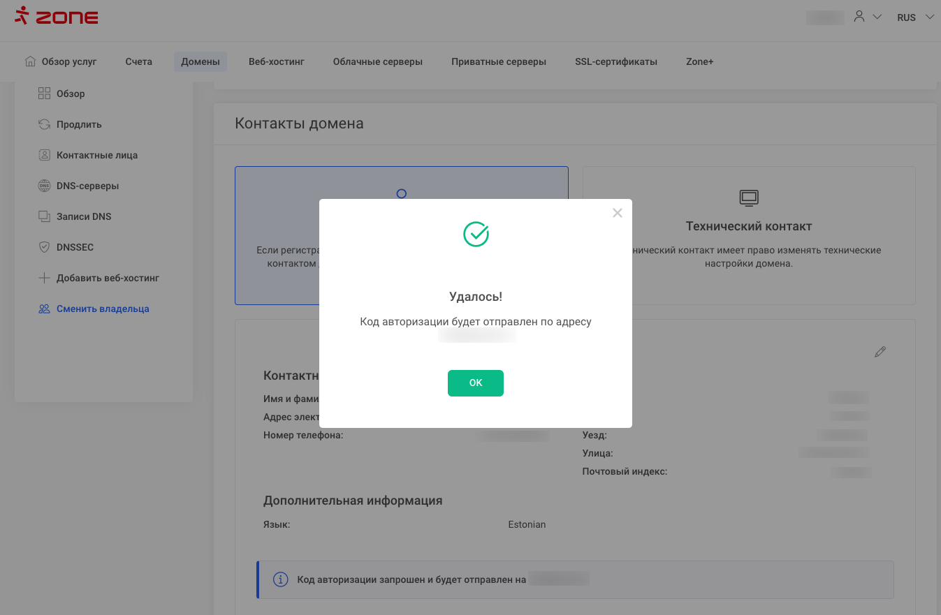 Код авторизации будет отправлен в течение 10-15 минут на контактный адрес электронной почты владельца домена.