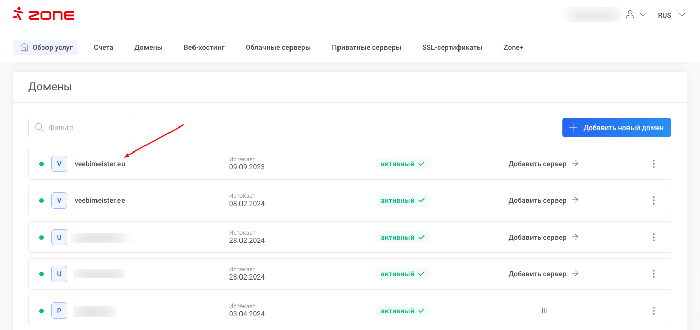 Для заказа кода авторизации домена, в панели управления Мой Zone на странице обзора услуг нажмите на соответствующее имя домена.