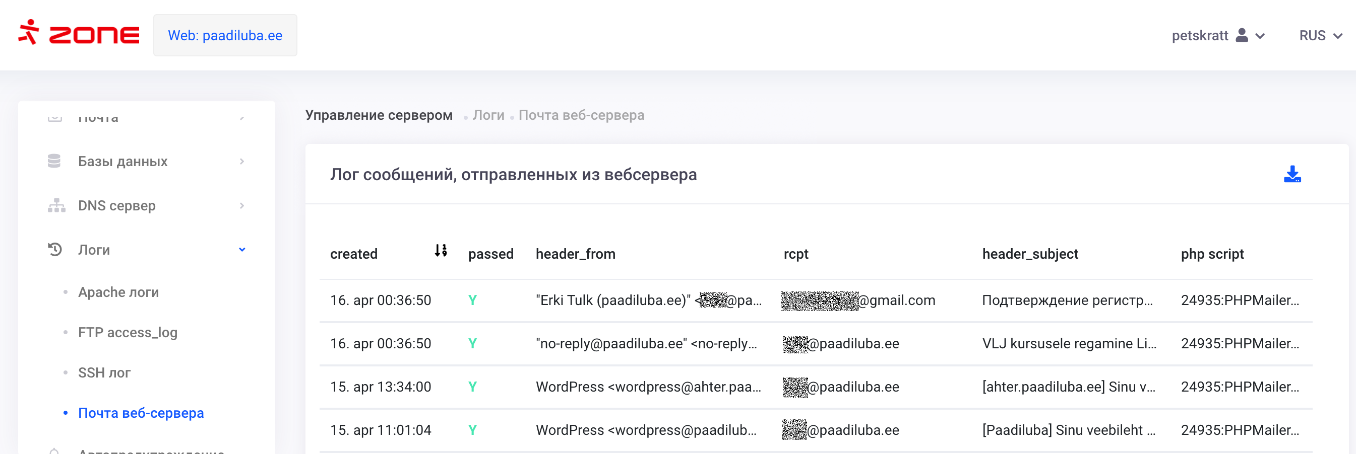 passed– прошло ли сообщение через фильтр? (N означает блокировку из-за превышения лимитов или обнаружения спама)header_from– адрес отправителя (envelope_from отображается в версии .json)rcpt– фактический получатель (также видны адреса bcc:; header_to отображается в версии .json)php script– скрипт использованный для отправки писем (только при использовании phpMailer PHP mail() – может отсутствовать, если использовалась альтернативная библиотека)