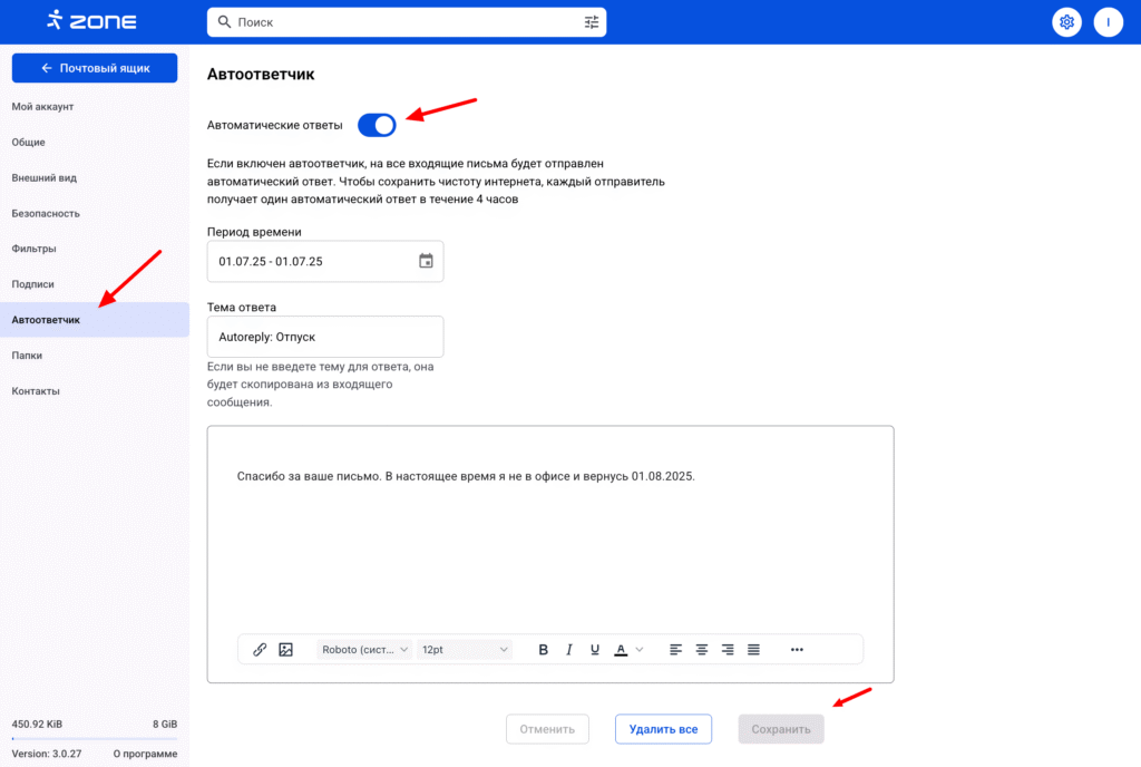 Нажмите кнопку Сохранить и активируйте опцию Автоматические ответы.