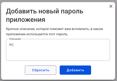 После этого следует добавить в поле Описание заметку для себя (например Outlook или название устройства) и нажать на кнопку Добавить.