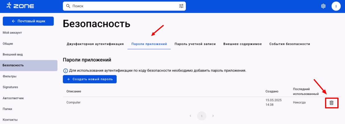 Чтобы удалить пароль приложения, нажмите значок Корзины.