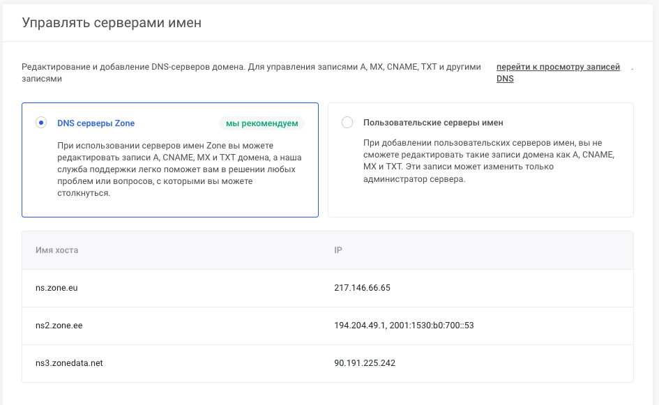 Если у вас есть доменное имя, для которого Zone не предлагает услуги регистратора, или если вы не хотите perenesti домен по какой-либо другой причине, вы можете перенаправить серверы имен от регистратора непосредственно в Zone.
