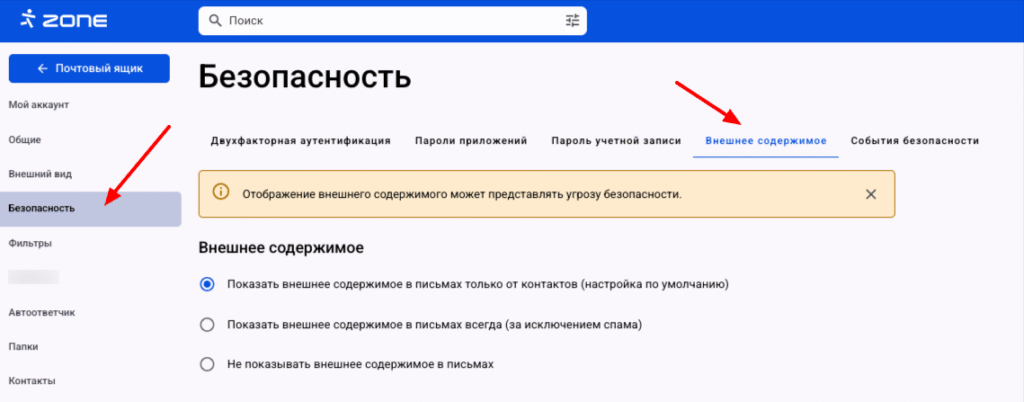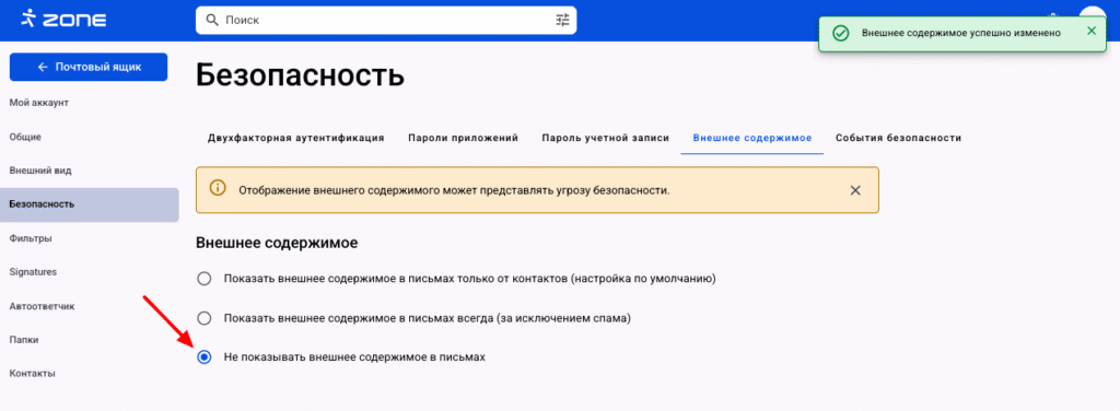 3. Не показывать внешнее содержимое в письмах – содержимое не отображается вообще.