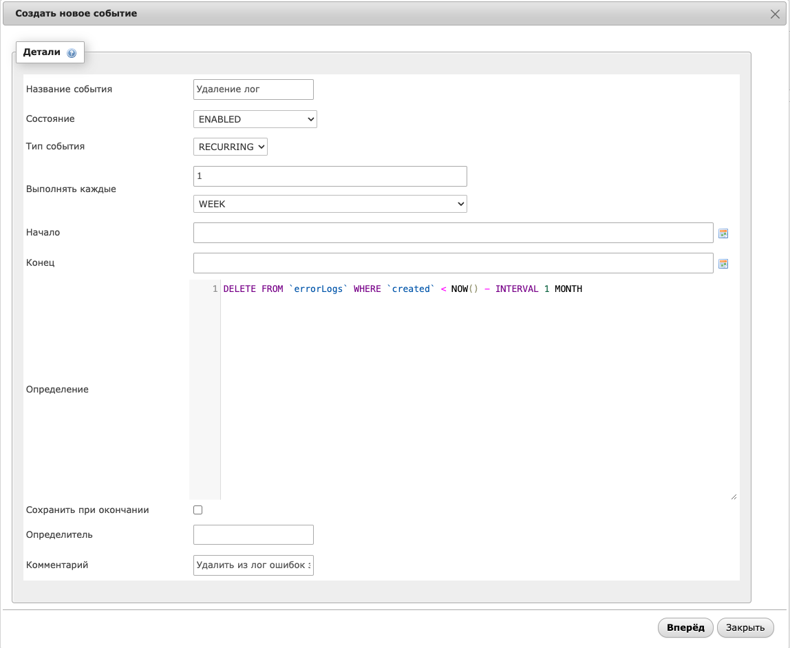 Самый простой способ добавить события – воспользоваться приложением phpMyAdmin. Выберите ссылку “Создать новое событие” на вкладке “События”. В появившемся окне вам нужно будет заполнить:
