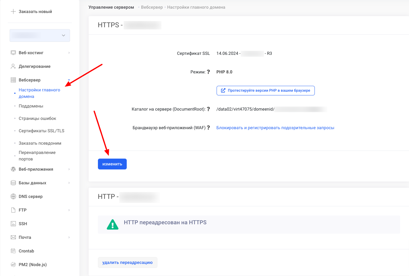 Чтобы активировать расширения PHP, выберите Вебсервер -> Настройки главного домена, а затем выберите изменить.