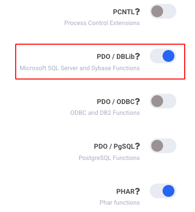 Для того, чтобы подключиться к MSSQL, необходимо активировать расширение PDO / DBLib в разделе Расширения PHP.