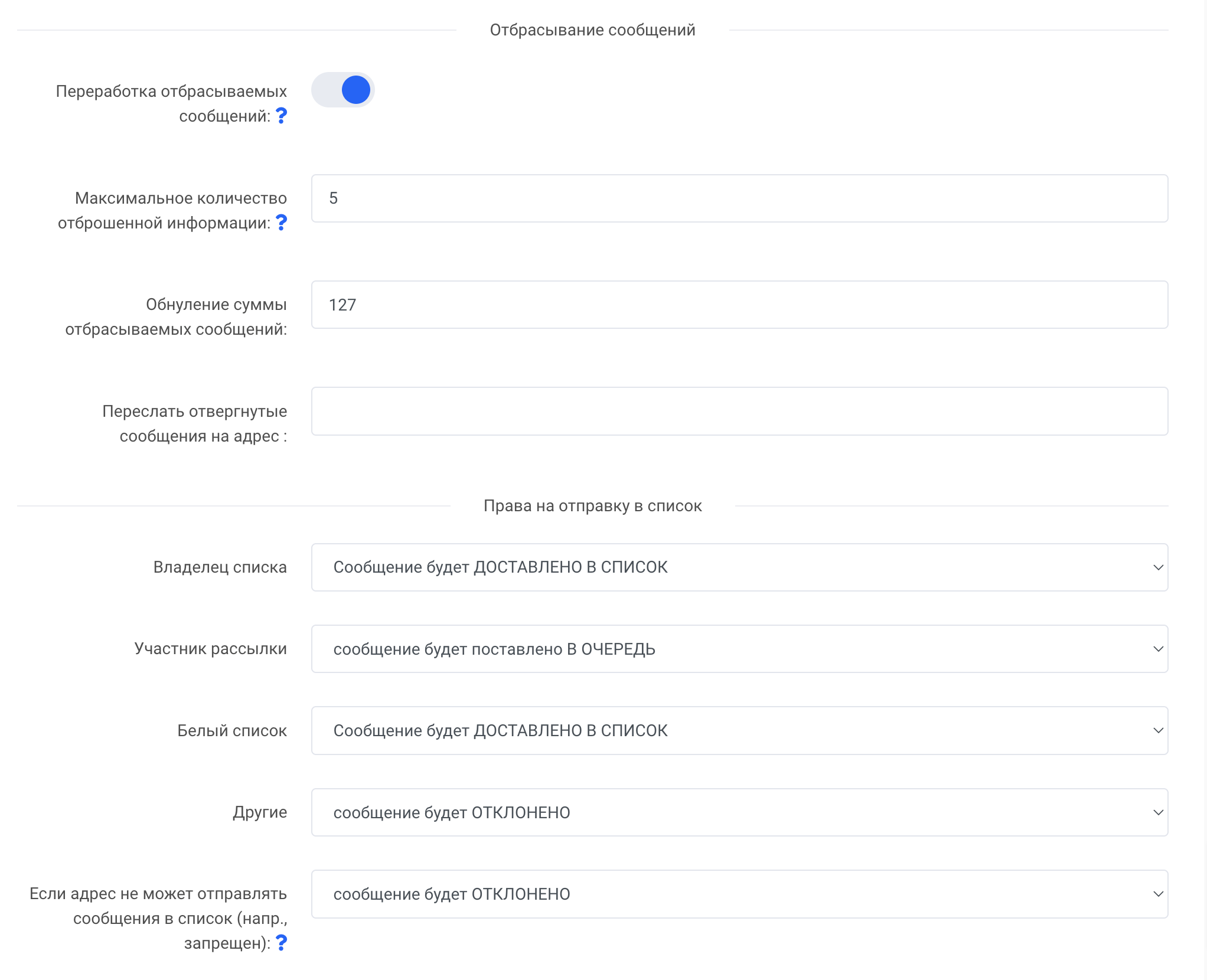 Переработка отбрасываемых сообщений: При переработке отбрасываемых сообщений, сумма отбрасываемых сообщений рассчитывается для каждого участника списка на основании отброшенных сообщений (например, если адрес не существует, почтовый ящик переполнен и т. д.). Если сумма отбрасываемых сообщений больше, чем максимальное количество отброшенной информации, тогда этот пользователь будет удален из списка. Укажите 0 количеством отброшенной информации для отключения автоматического удаления. Сумму отбрасываемых сообщений можно автоматически обнулить, если в графе указать соответствующее количество дней. В таком случае расчет начнется заново. Используйте 0, чтобы отключить эту функцию.