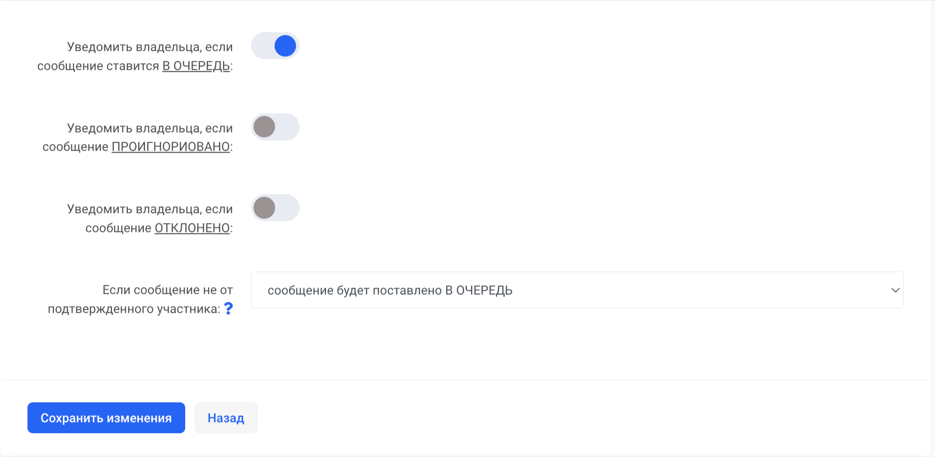 Уведомить владельца, если сообщение ставится В ОЧЕРЕДЬ , если сообщение ПРОИГНОРИРОВАНО или если сообщение ОТКЛОНЕНО: у владельца списка рассылки есть возможность получить уведомление, если сообщение ставится в очередь, игнорируется или отправляется обратно.