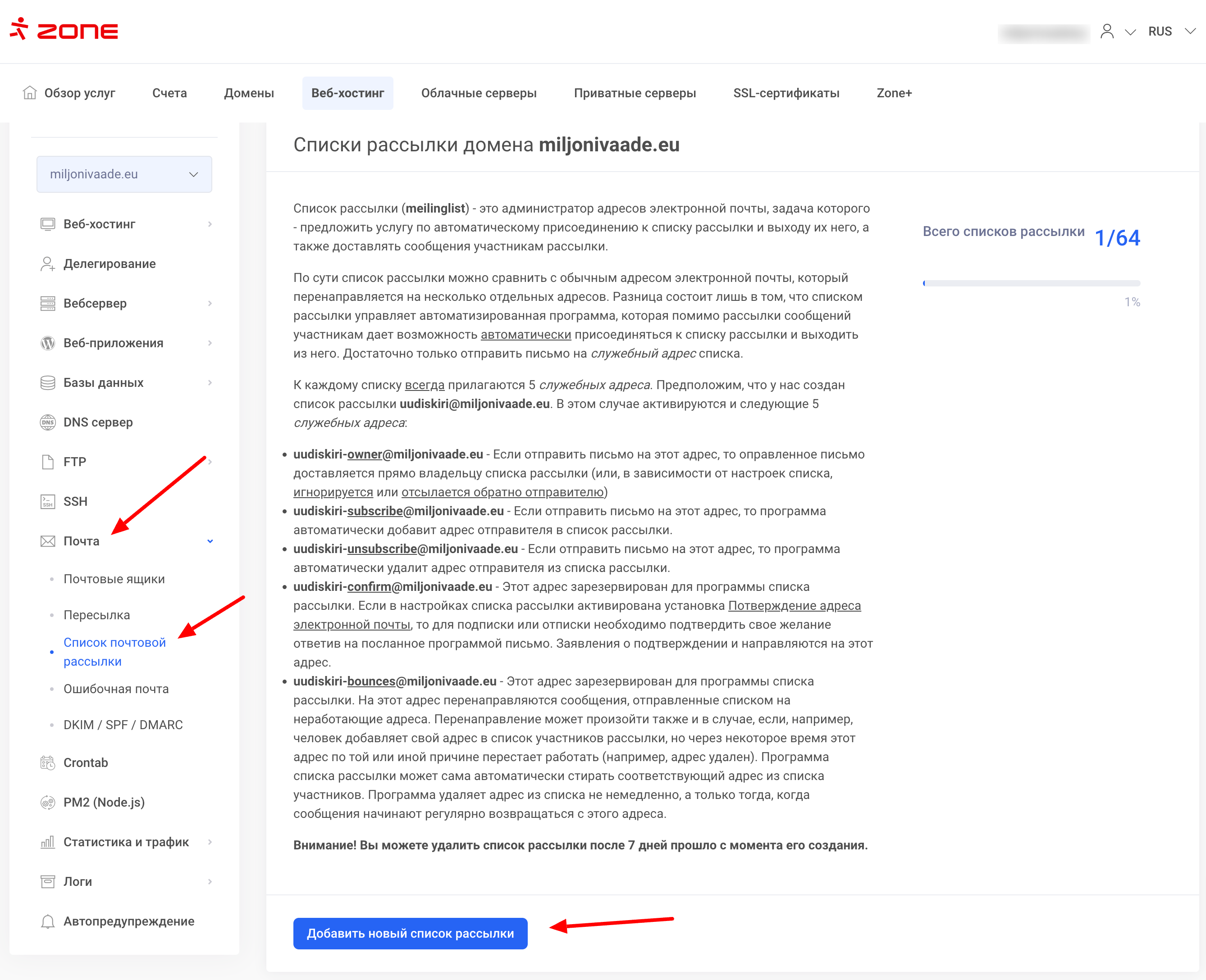 1. Для настройки почтовой рассылки войдите в Мой Zoneи на странице обзора услуг нажмите на соответствующий хостинг. Затем в меню слева Почта , Список почтовой рассылкии Добавить новый список рассылки.