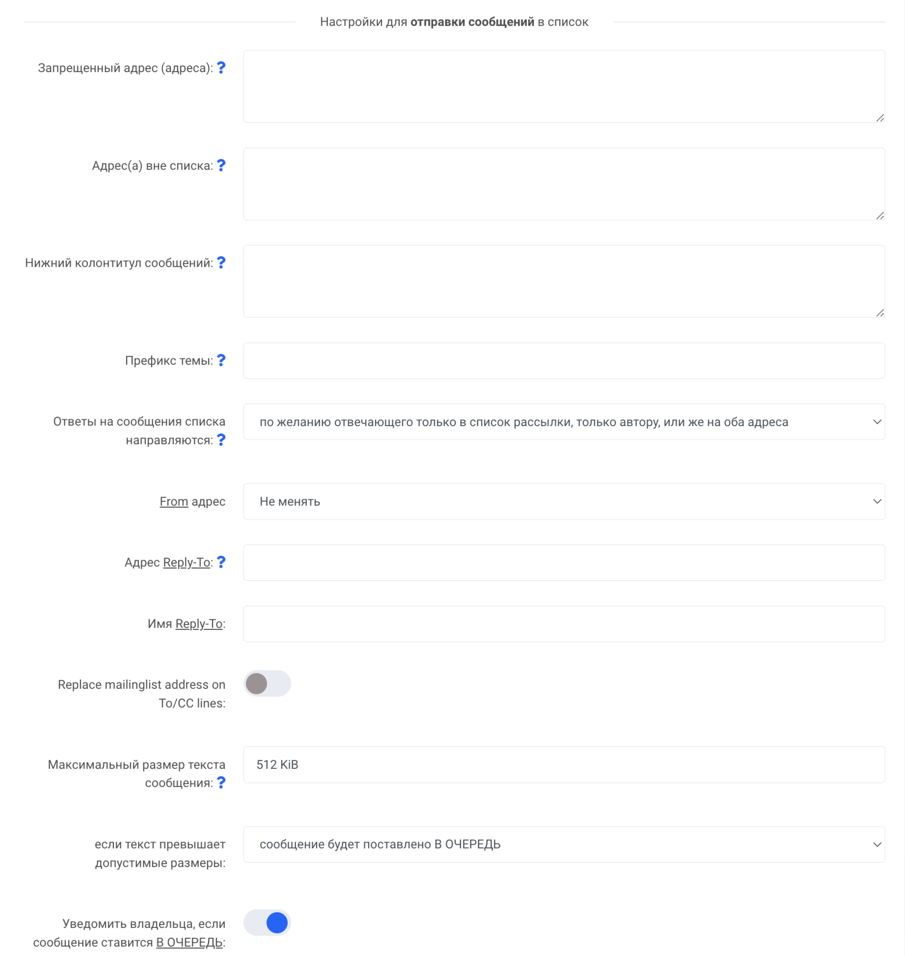 В разделе прав на отправку в список, можно отметить, как действует программа рассылки при отправке писем в список разными отправителями — ставятся ли письма в очередь, игнорируются или отклоняются.