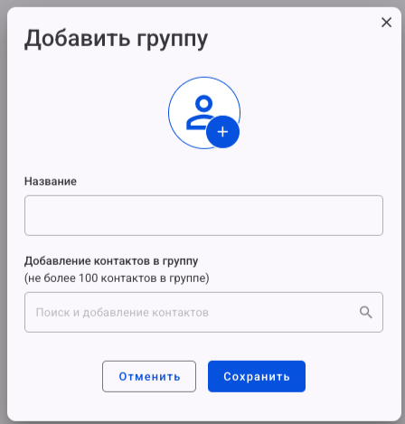 Максимальное количество участников в группе — 100.  Добавьте название, контакт и нажмите Сохранить.