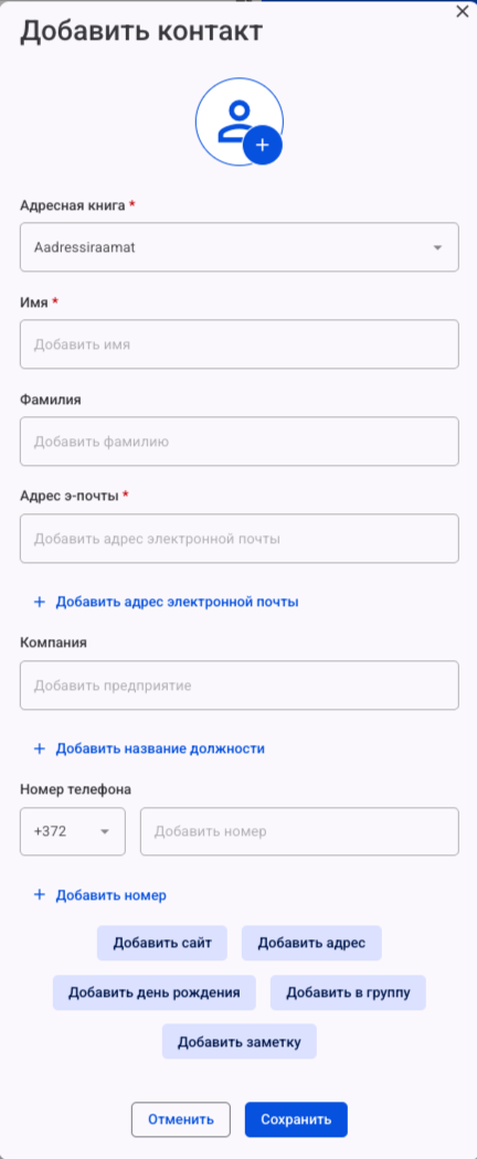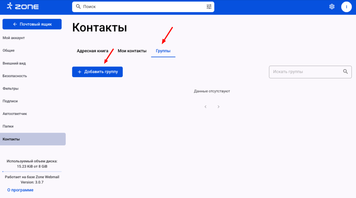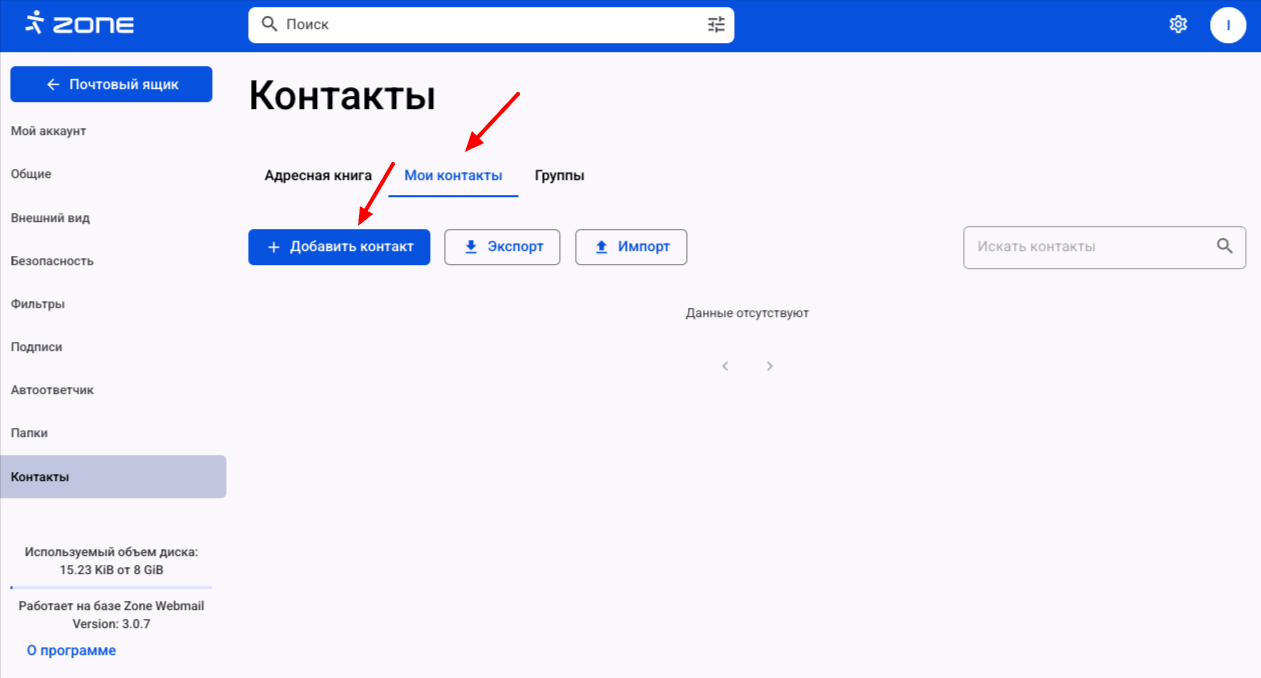 После создания адресной книги перейдите в раздел Мои контакты и нажмите Добавить контакт.