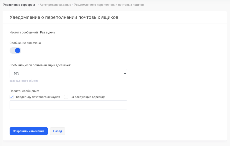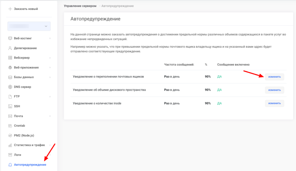 Для того, чтобы предотвратить ситуацию, когда объемы хостинга заканчивается, что приводит к простою услуги, можно настроить отправку автопредупреждений по электронной почте.