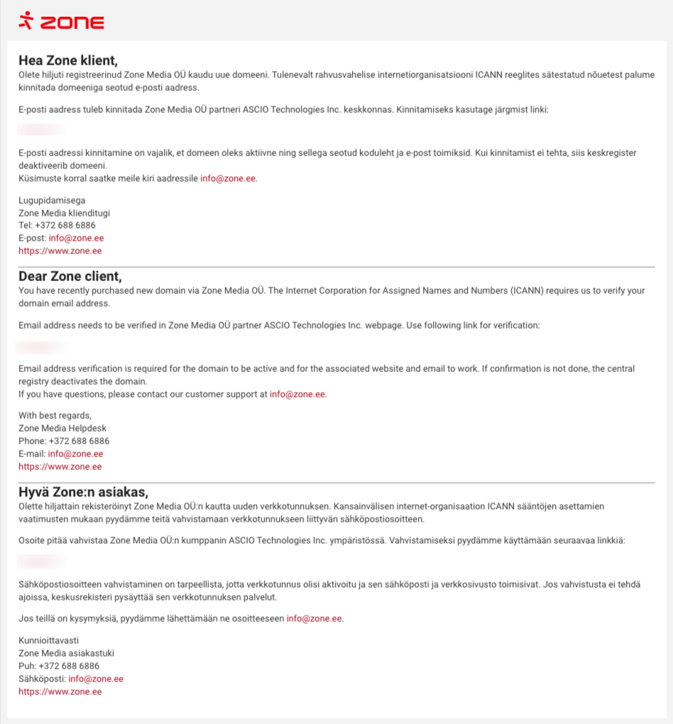 После регистрации необходимо проверить контактный адрес электронной почты домена. На адрес электронной почты регистранта будет отправлено письмо, содержащее уникальную ссылку, по которой регистрант может проверить или подтвердить свой адрес электронной почты. Домен станет активным только после завершения процесса верификации. Поэтому при регистрации домена необходимо использовать действительный адрес электронной почты.