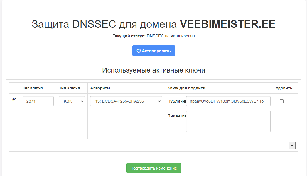 Сохраните добавление DS-записи, нажав кнопку Подтвердить изменение, после чего DNSSEC будет активирован.