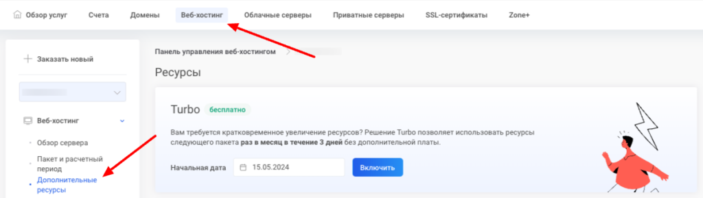 Кнопку Turbo можно в панели управления Мой Zone выбрав Веб-хостинг. Если на аккаунте имеется более одного пакета серверных услуг, откройте управление нужным сервером, а затем выберите Дополнительные ресурсы в разделе Веб-хостинг.