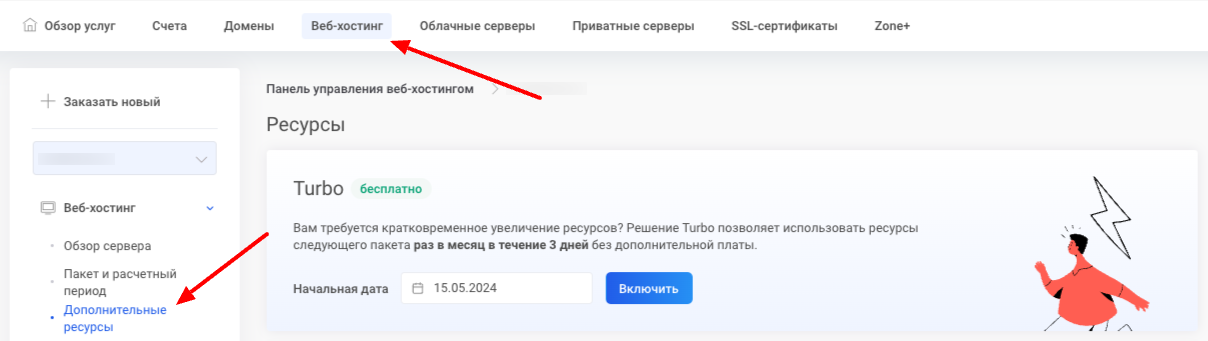 Кнопку Turbo можно в панели управления Мой Zone выбрав Веб-хостинг. Если на аккаунте имеется более одного пакета серверных услуг, откройте управление нужным сервером, а затем выберите Дополнительные ресурсы в разделе Веб-хостинг.