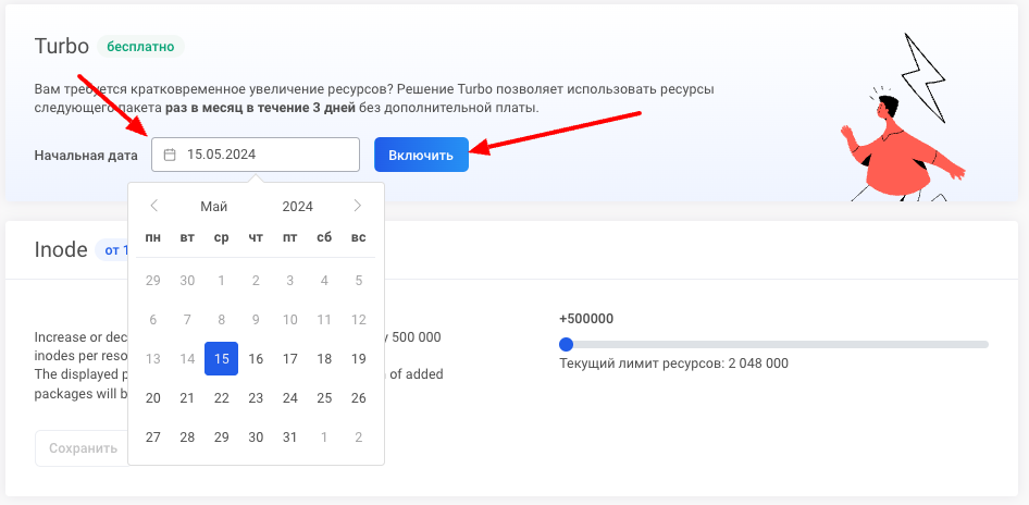 Для того, чтобы активировать кнопку Turbo, сначала выберите дату, когда потребуются дополнительные ресурсы, а затем нажмите кнопку Включить.