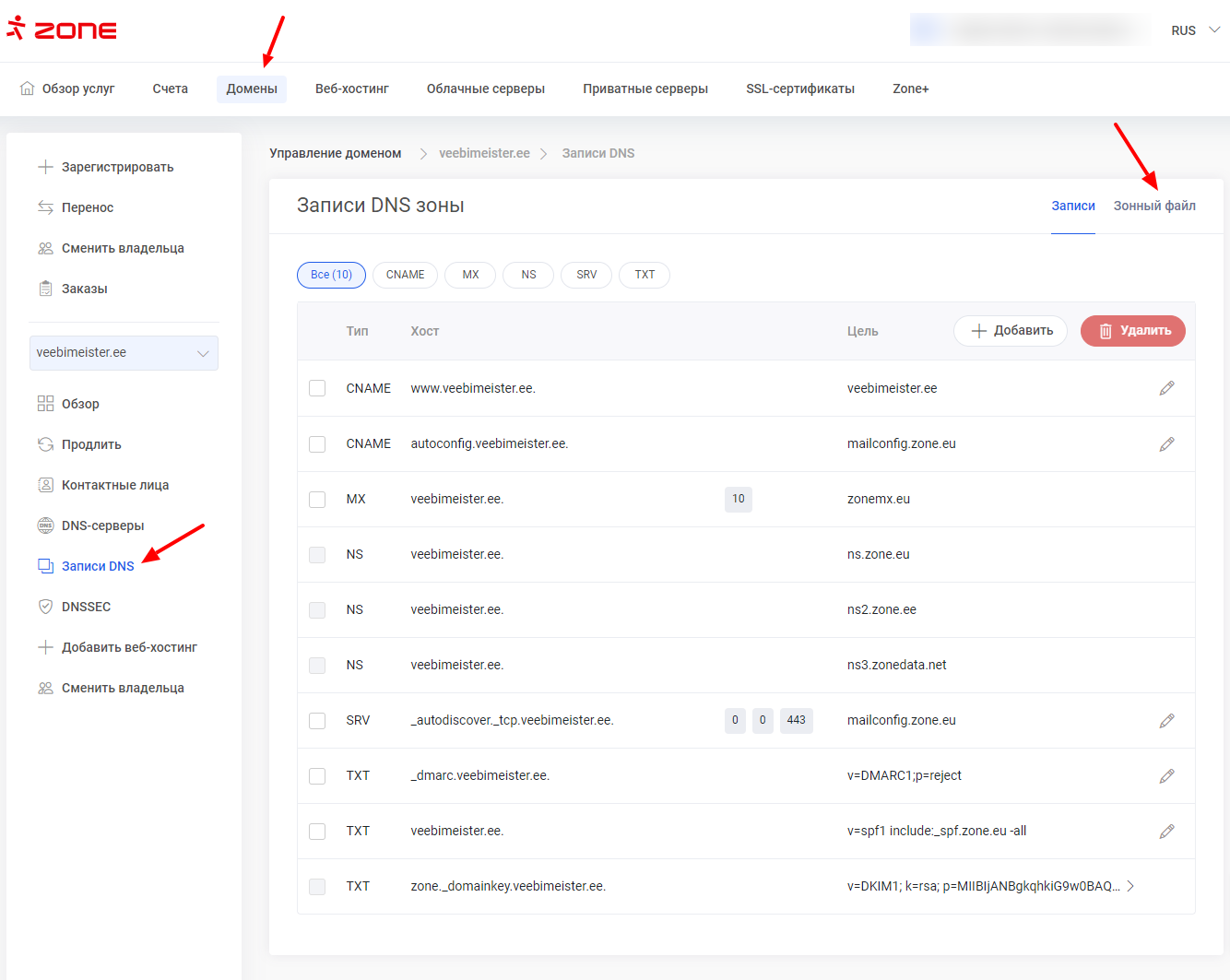 Если вы пользуетесь услугами хостинга в другом месте, но домен находится в Zone и использует серверы имен Zone, зонный файл можно найти в управлении доменом в разделе Записи DNS: